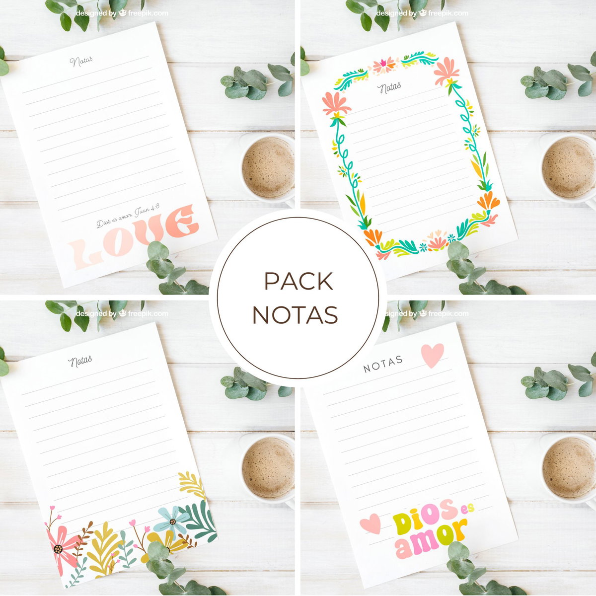 Formato A5 y A4, rayados, con versรญculos integrados.